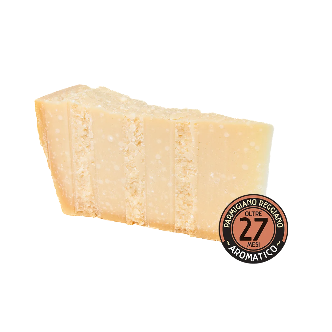 With its crumbly, grainy texture and full flavour, Parmigiano Reggiano aged 27 months is perfect for every type of dish. Highly digestible, it offers a well-balanced taste between sweet and savoury.