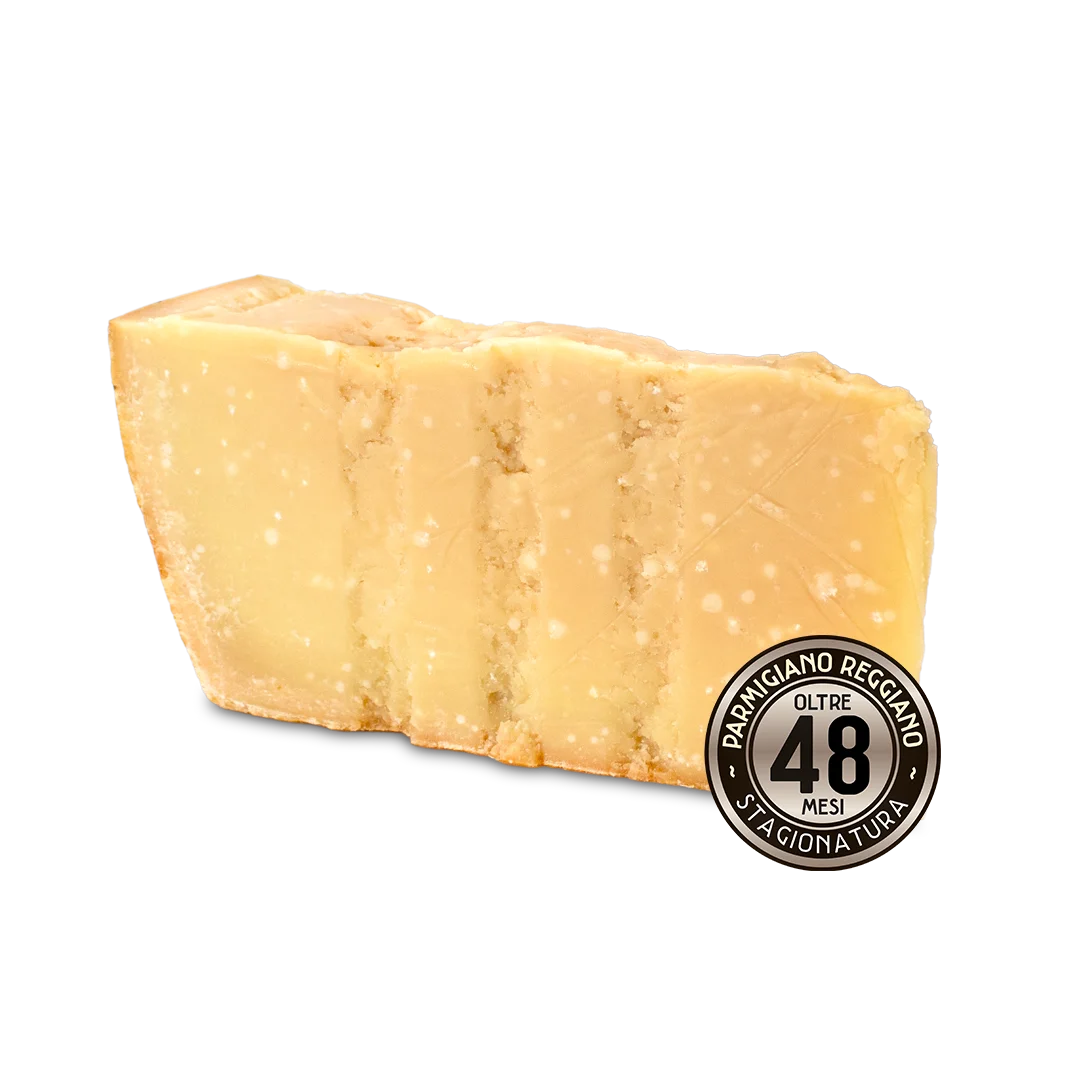 Our extra-aged Parmigiano Reggianois drier, grainier, and even more crumbly. Rich in intense aroma, it is highly digestible and especially recommended for children and those who are lactose intolerant. It can be enjoyed whole, grated or in shavings, paired with honey or balsamic vinegar.